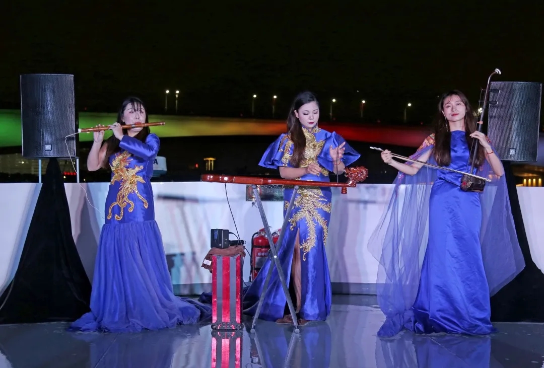 微風(fēng)拂面,夜景怡人,滿載游客的3艘邕江游船來(lái)回穿梭在邕江之上,沿江兩岸燈光絢麗多彩,跨江大橋恢弘大氣,民樂(lè)表演風(fēng)情十足,乘船游客紛紛拿出手機(jī)、相機(jī)合影留念。